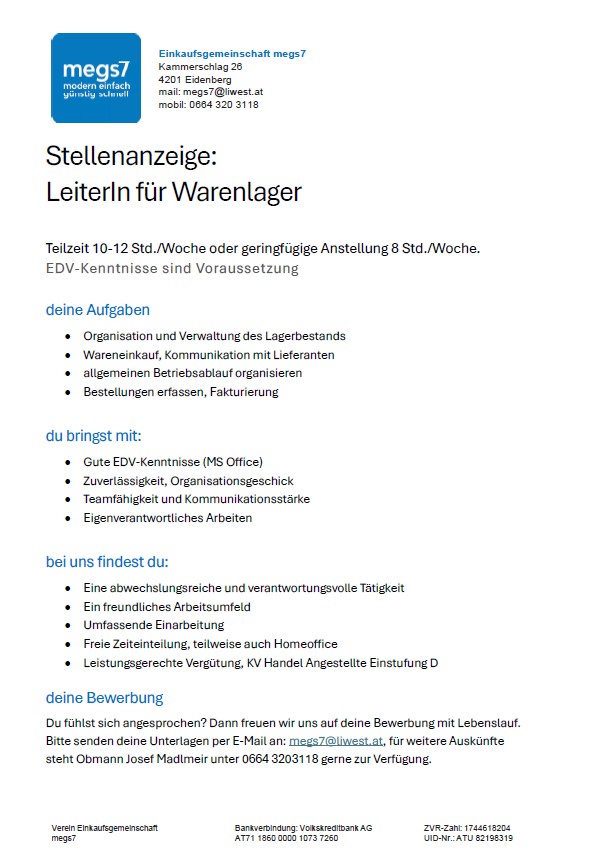 Stellenanzeige für LeiterIn für Warenlager.